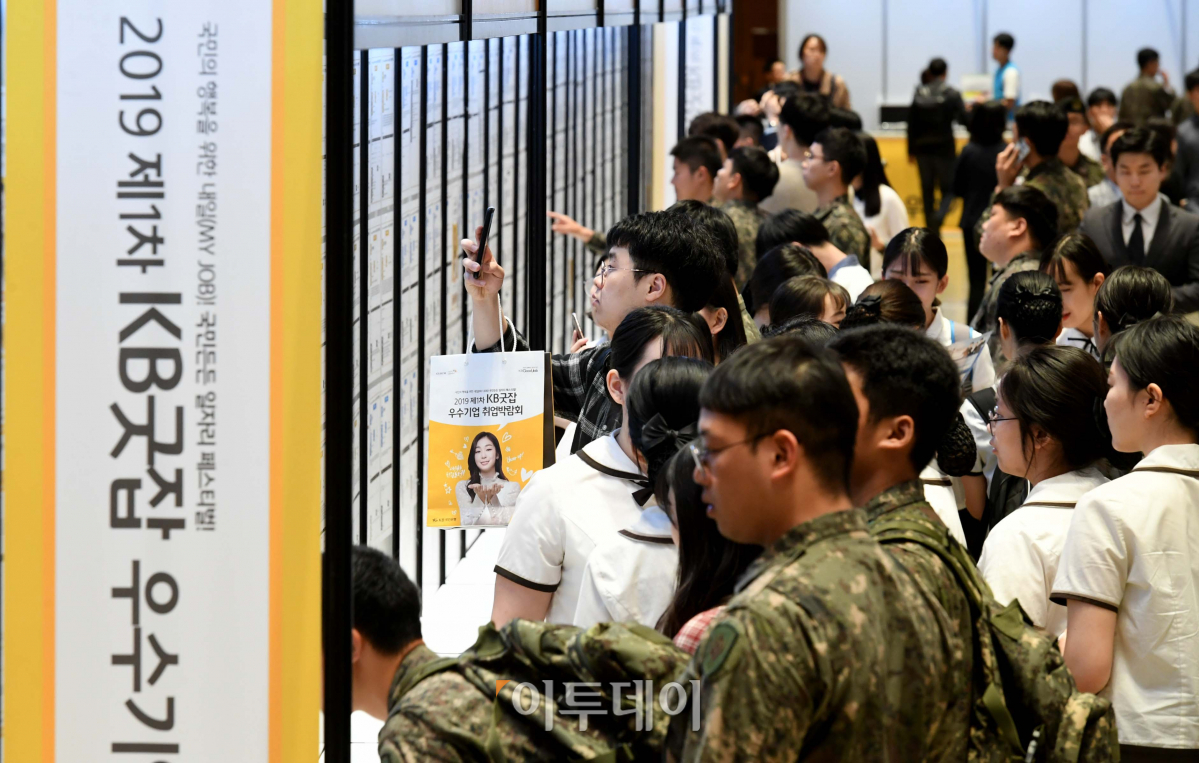 28일 서울 강남구 영동대로 코엑스에서 열린 ‘2019 제1차 KB굿잡 우수기업 취업박람회’에서 구직자들이 채용공고게시판을 살펴보고 있다. 250여개 중소·중견기업이 참여하는 이번 박람회는 29일까지 열린다. 신태현 기자 holjjak@