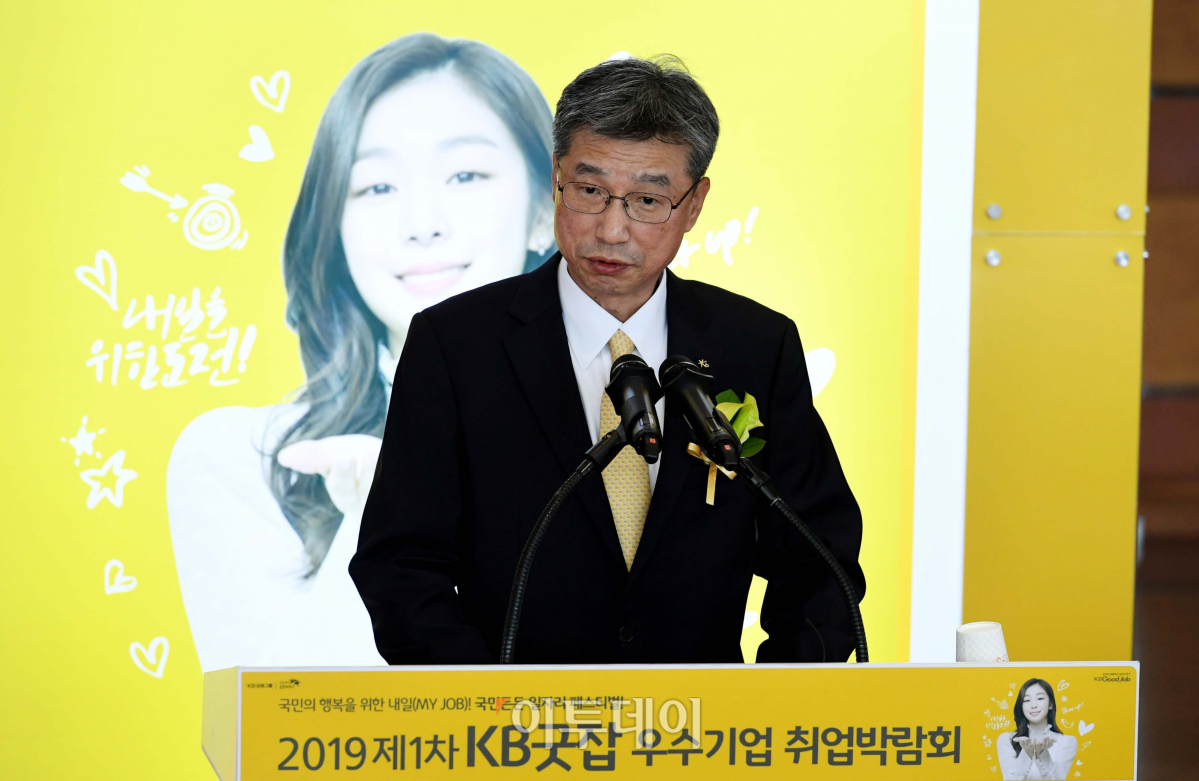 허인 KB국민은행장이 28일 서울 강남구 영동대로 코엑스에서 열린 ‘2019 제1차 KB굿잡 우수기업 취업박람회’ 개막식에서 인사말을 하고 있다. 250여개 중소·중견기업이 참여하는 이번 박람회는 29일까지 열린다. 신태현 기자 holjjak@