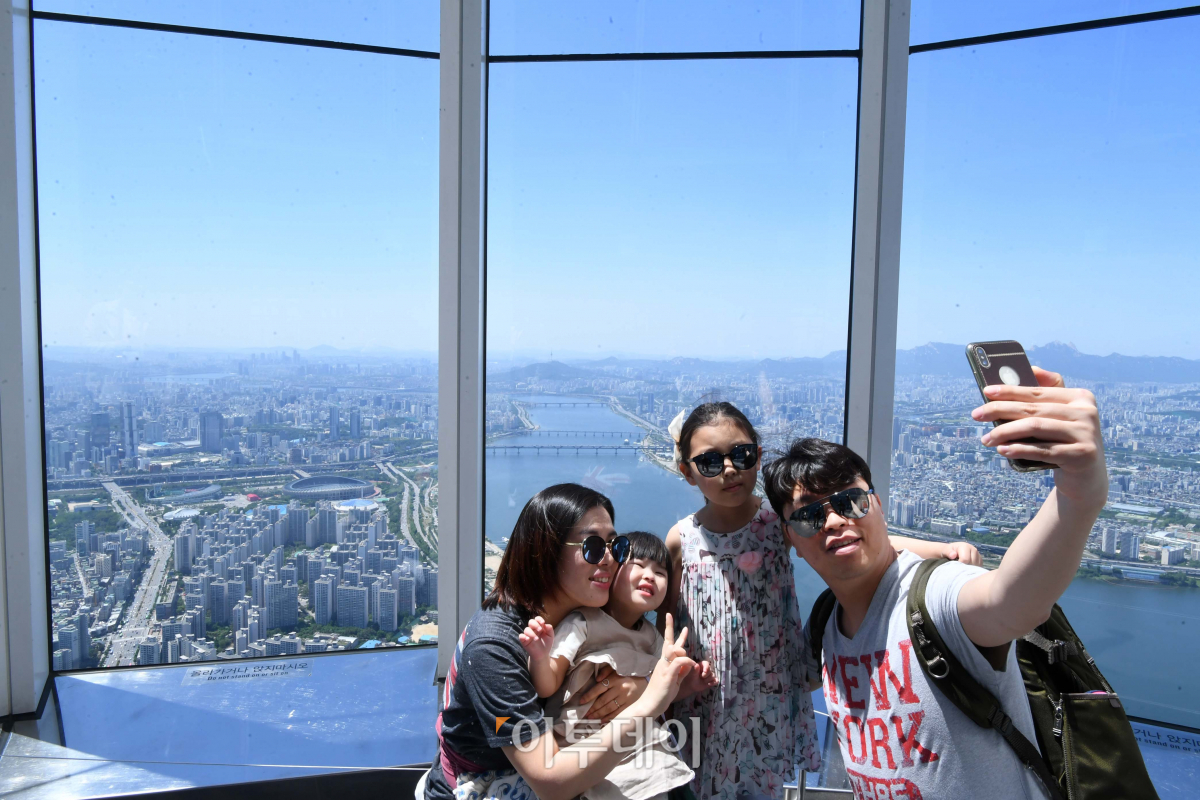 전국이 맑고 쾌청한 날씨를 보인 28일 서울 송파구 송파대로 롯데월드타워 서울스카이를 찾은 한 가족이 푸른 하늘을 배경으로 기념촬영을 하고 있다. 신태현 기자 holjjak@
