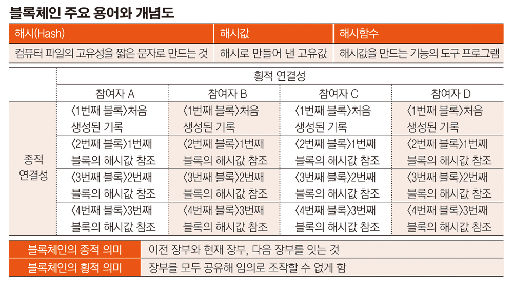 블록체인이란 용어도 여기에서 나왔는데요. 장부를 블록이라고 한다면, 블록들을 해시라는 기술로 체인처럼 연결한다는 뜻이죠.