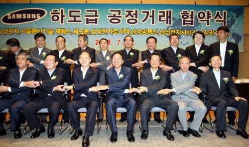 삼성전자의 7개 계열회사, 주요 협력사 대표들이 '하도급 공정거래 협약'을 체결한 후 손을 맞잡고 있는 모습.