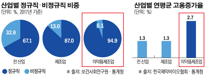 R&D 성장에 기반을 둔 고용 증가 효과도 뚜렷하다. 제약·바이오산업은 최근 10년간 연평균 2.7%의 고용증가율을 기록해 전 산업 고용증가율(1.3%)을 2배 이상 추월했다. 또한, 정규직 비중이 94.9%에 달해 다른 제조업(87.0%) 대비 양질의 일자리를 제공하는 것으로 분석된다.