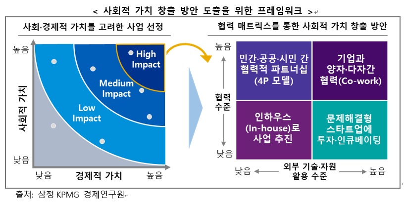 4차 산업혁명 시대에서 협력 매트릭스를 통한 사회적 가치 창출 방안으로는 △인하우스(In-house) 사업 추진 △문제 해결형 스타트업 투자·인큐베이팅 △민간·공공·시민 간 협력적 파트너십 △기업과의 양자·다자 간 협력을 제시했다.
