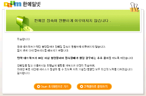 다음 한메일은 22일 오후 3시50분 부터 약 50분 동안 타인 메일을 볼 수 있는 등 심각한 로그인 오류가 발생했다. 한메일에 로그인해 자신의 아이디를 클릭하면 다른 사람의 메일을 목록을 볼 수 있었던 것이다.