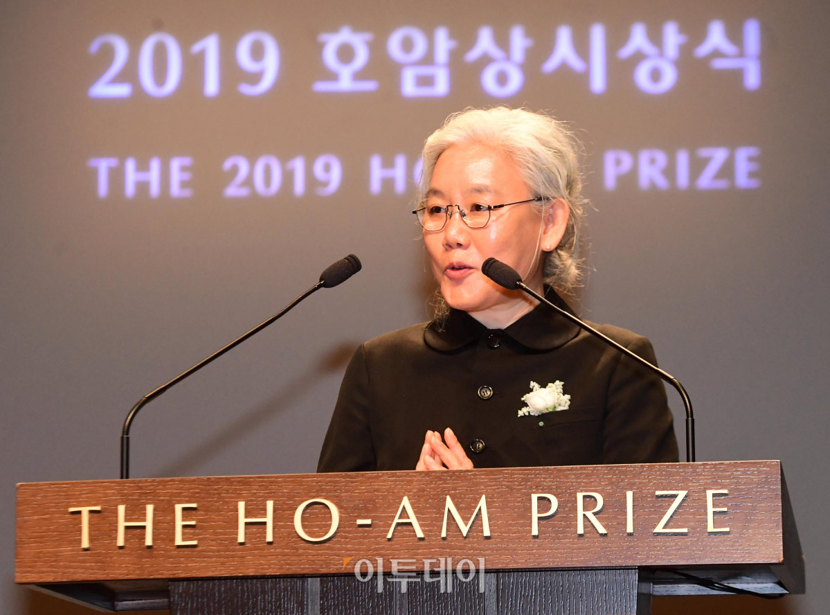 2019 호암상 시상식이 31일 서울 중구 호암아트홀에서 열린 가운데 예술상을 수상한 이불 현대미술작가가 수상소감을 밝히고 있다. 고이란 기자 photoeran@