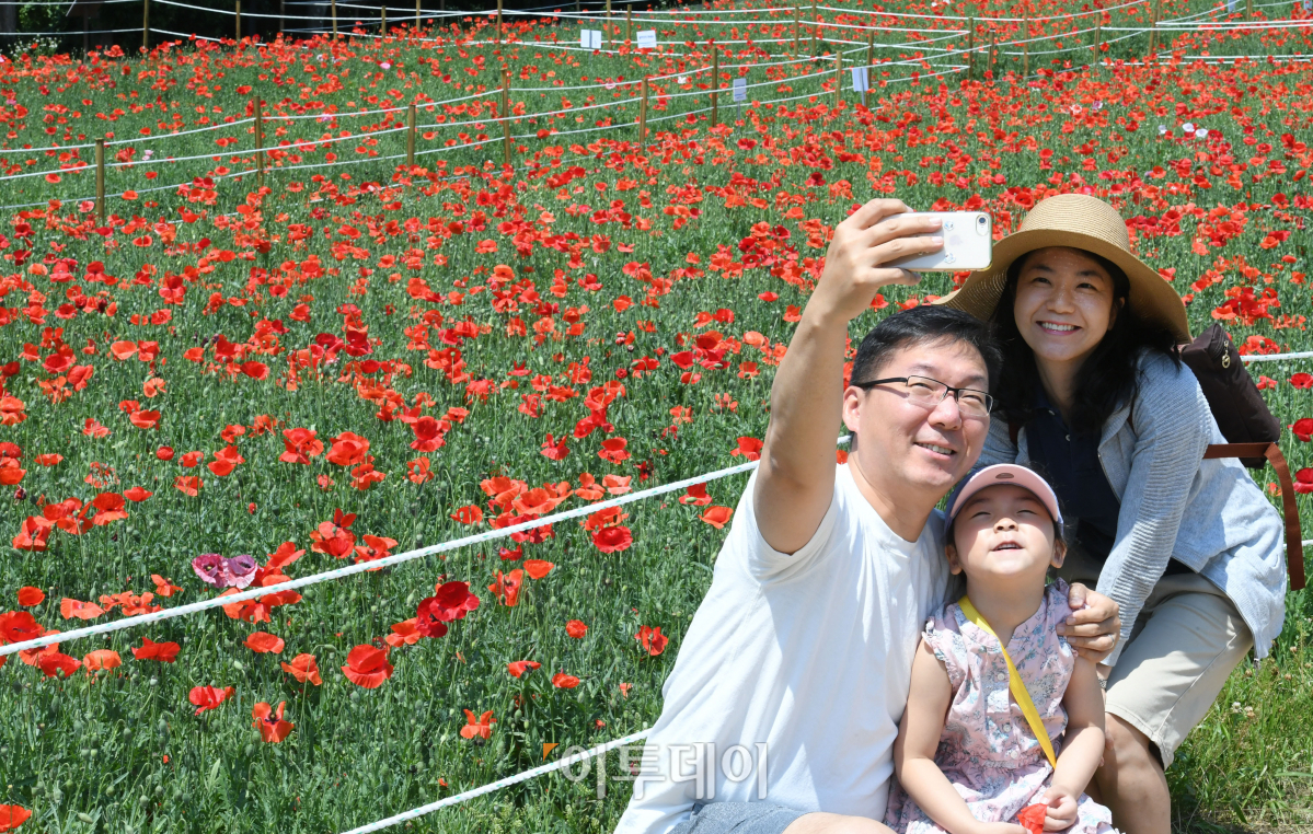 서울 낮 기온이 28도, 대구가 31도를 기록하는 등 전국이 쾌청한 초여름 날씨를 보인 2일 서울 송파구 올림픽로 올림픽공원에서 한 가족이 붉게 핀 꽃양귀비를 배경으로 기념촬영을 하고 있다. 기상청은 4일 서울 낮 기온이 30도를 나타내는 등 기온이 이번 주 중반까지 오름세를 보일 것으로 예상했다. 신태현 기자 holjjak@