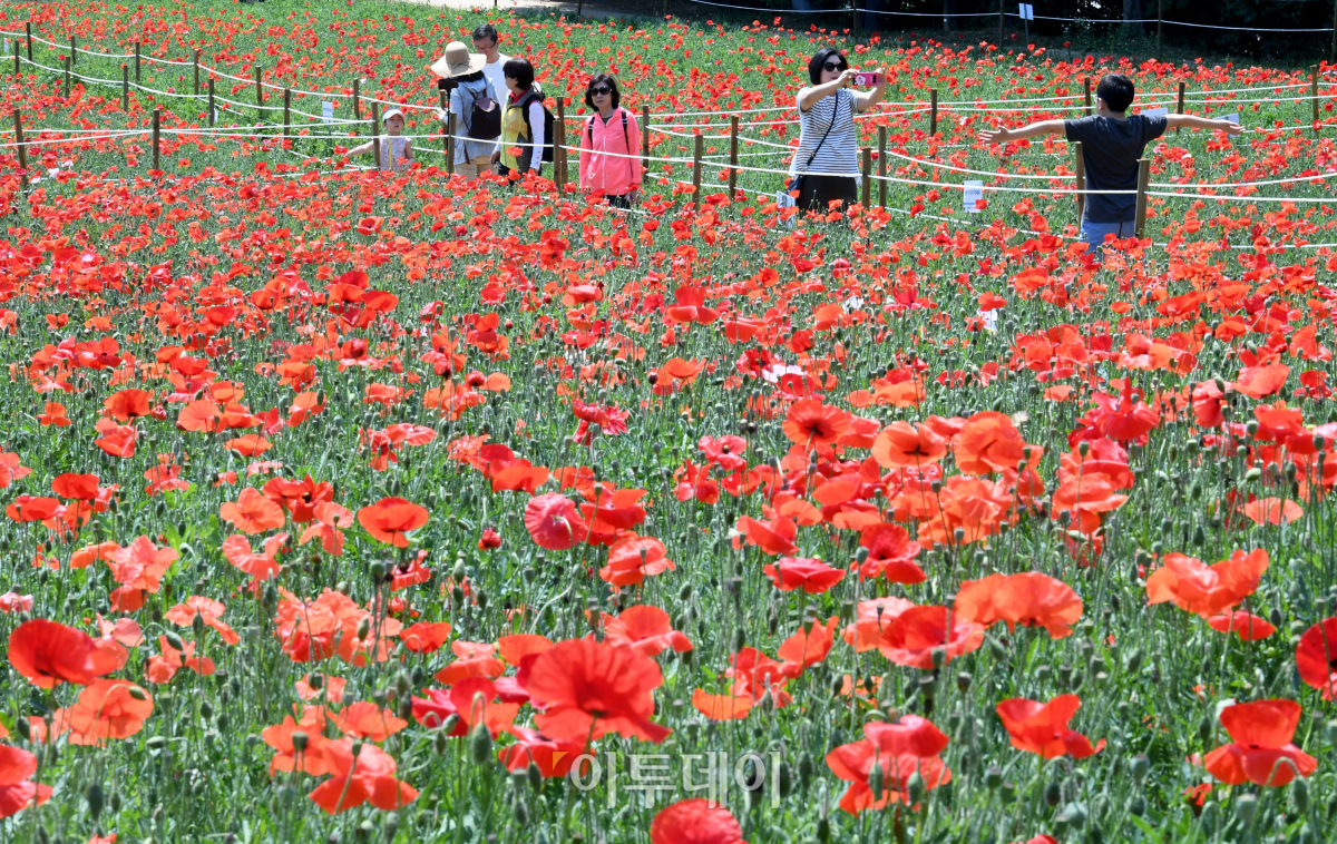 서울 낮 기온이 28도, 대구가 31도를 기록하는 등 전국이 쾌청한 초여름 날씨를 보인 2일 서울 송파구 올림픽로 올림픽공원에 붉게 핀 꽃양귀비가 계절의 정취를 전하고 있다. 기상청은 4일 서울 낮 기온이 30도를 나타내는 등 기온이 이번 주 중반까지 오름세를 보일 것으로 예상했다. 신태현 기자 holjjak@
