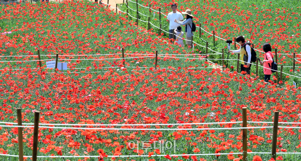 서울 낮 기온이 28도, 대구가 31도를 기록하는 등 전국이 쾌청한 초여름 날씨를 보인 2일 서울 송파구 올림픽로 올림픽공원에 붉게 핀 꽃양귀비가 계절의 정취를 전하고 있다. 기상청은 4일 서울 낮 기온이 30도를 나타내는 등 기온이 이번 주 중반까지 오름세를 보일 것으로 예상했다. 신태현 기자 holjjak@