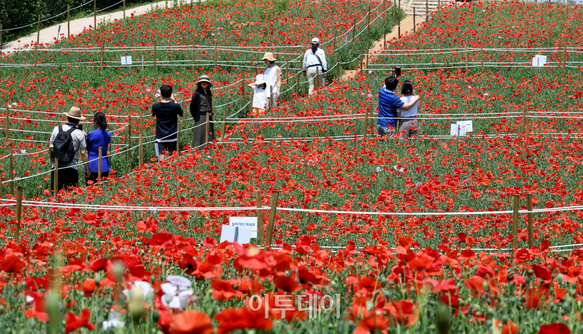 서울 낮 기온이 28도, 대구가 31도를 기록하는 등 전국이 쾌청한 초여름 날씨를 보인 2일 서울 송파구 올림픽로 올림픽공원에 붉게 핀 꽃양귀비가 계절의 정취를 전하고 있다. 기상청은 4일 서울 낮 기온이 30도를 나타내는 등 기온이 이번 주 중반까지 오름세를 보일 것으로 예상했다. 신태현 기자 holjjak@