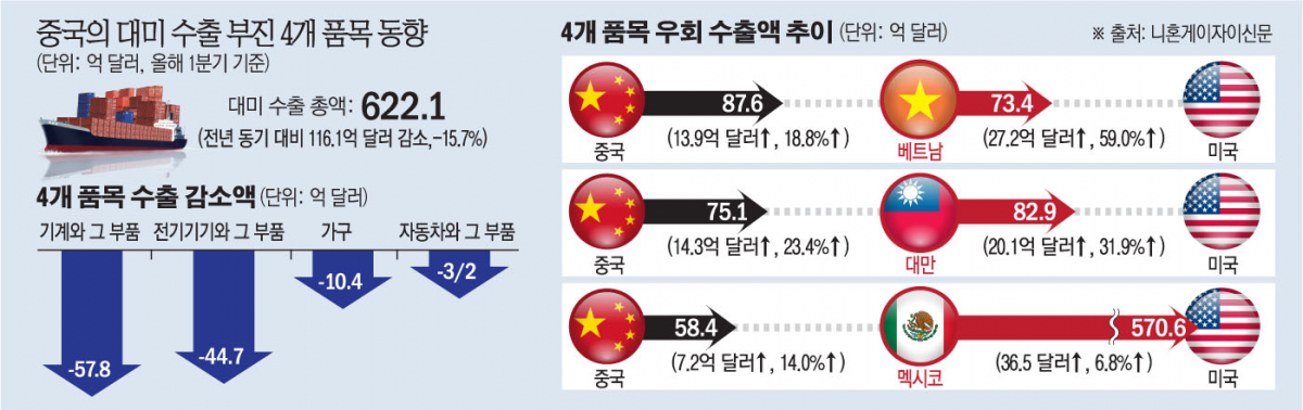 중국의 올해 1분기 대미국 수출에서 가장 침체된 기계와 그 부품, 전기기기와 관련 부품, 가구, 자동차 및 부품 등 총 4개 품목의 움직임을 추적한 결과 베트남과 대만, 멕시코 등 3개국을 경유한 수출이 늘었다고 1일(현지시간) 일본 니혼게이자이신문이 분석했다.