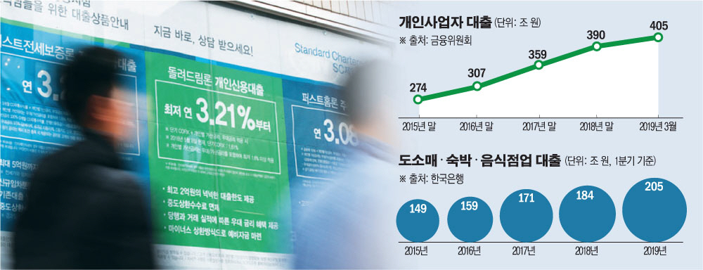 ◇도소매·숙박음식점 대출, 금융위기 이후 최고 급증… 가계 빚 ‘신 뇌관’ = 2008년 금융위기 이후 도소매·숙박음식점 대출이 가장 큰 폭으로 증가했다. 골목 상권이 빚으로 연명하고 있는 것 아니냐는 우려가 나오고 있다. 한국은행의 올 1분기 ‘예금취급기관 산업별 대출금’ 자료에 따르면 1분기 서비스업 가운데 도·소매업 대출 잔액은 149조 원이다. 이는 2008년 금융위기 이후 10년 9개월 만에 가장 큰 폭으로 증가한 수치다. 도소매업에 숙박음식점업까지 포함한 대출은 205조8000억 원으로, 2009년 1분기(11.8%) 이후 10년 만에 최고치를 기록했다.