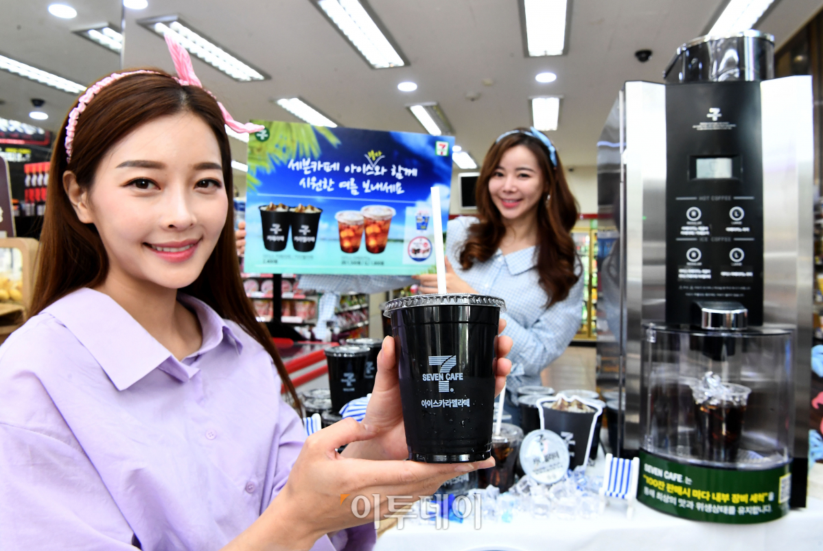 세븐일레븐이 여름 성수기를 맞아 3일 서울 중구 남대문로 세븐일레븐 소공점에서 자체 원두커피 브랜드 ‘세븐카페’ 커피를 선보이고 있다. 세븐일레븐은 올해 ‘세븐카페 아이스 아메리카노’와 ‘아이스 카페라떼’의 품질을 개선해 출시했으며 ‘아이스 카라멜라떼’도 새롭게 선보였다. 신태현 기자 holjjak@