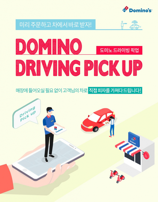4월부터 도미노 드라이빙 픽업 서비스를 진행한 결과 높은 고객 만족도를 보여 확대 시행한다. 온라인 방문포장 주문 시 ‘기타 요청사항’ 란에 차량번호를 기입한 후 매장 앞에 도착한 고객이 전화를 하면 고객의 차량까지 매장 직원이 직접 피자를 전달한다. (단, 30분 전 선 결제 주문에 한정)