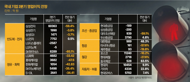 화학·정유업계의 성적표는 더 암울하다. LG화학, 롯데케미칼, 한화케미칼 등의 2분기 영업이익은 지난해 같은 기간보다 33.4% 47.5%, 42.8%씩 급감할 것으로 우려된다.