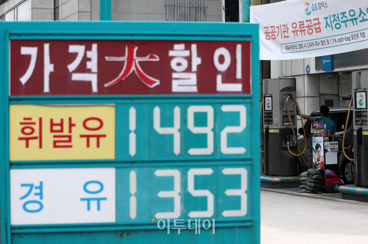 연이어 치솟던 휘발유 가격이 16주 만에 하락세를 보인 가운데 9일 서울의 한 주유소 휘발유 가격표시판이 1492원을 가리키고 있다. 한국석유공사 유가 정보 서비스 ‘오피넷’에 따르면 이달 첫째 주 전국 주유소의 보통 휘발유 판매가격은 전주보다 리터당 1.2원 내린 1535.1원을 나타냈다. 신태현 기자 holjjak@