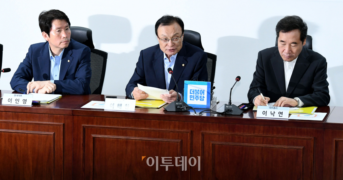 이해찬 더불어민주당 대표가 10일 서울 여의도 국회 의원회관에서 열린 확대 고위당정협의회에서 모두발언을 하고 있다. 이날 당정협의회에선 추가경정예산안(추경) 처리방안 등이 논의됐다. 신태현 기자 holjjak@