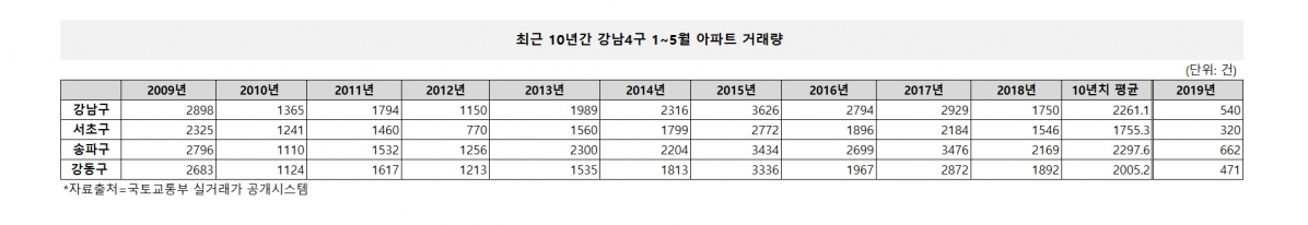 10일 국토교통부 실거래가공개시스템에 따르면 올해 1월부터 5월까지 강남4구의 아파트 거래량은 총 1993건으로 집계됐다. 자치구별로는 강남 540건, 서초 320건, 송파 662건, 강동 471건이다.