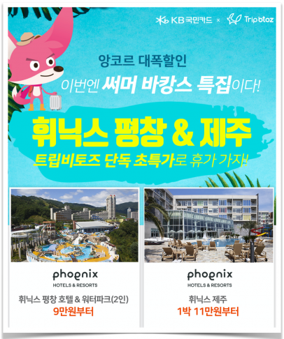 오는 13일 오전 11시부터 트립비토즈에 접속하여 국민카드로 휘닉스 평창•제주를 결제하는 고객 선착순 100명에게 5만원 즉시 할인 혜택을 제공한다. 회원당 1회 한정이며, 투숙 가능한 기간은 6월 13일부터 8월 31일까지이다.