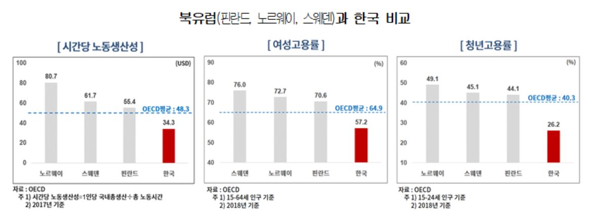 시간당 노동생산성은 OECD 국가들 중에서 노르웨이 2위, 스웨덴 8위, 핀란드 13위로 높은 순위를 기록했다.북유럽의 성인역량과 인적자원 수준은 OECD중 최상위다. 북유럽 국가들의 여성 고용률은 70% 이상이며, 청년 고용률도 한국(26.2%)의 2배 가까운 수준이다.