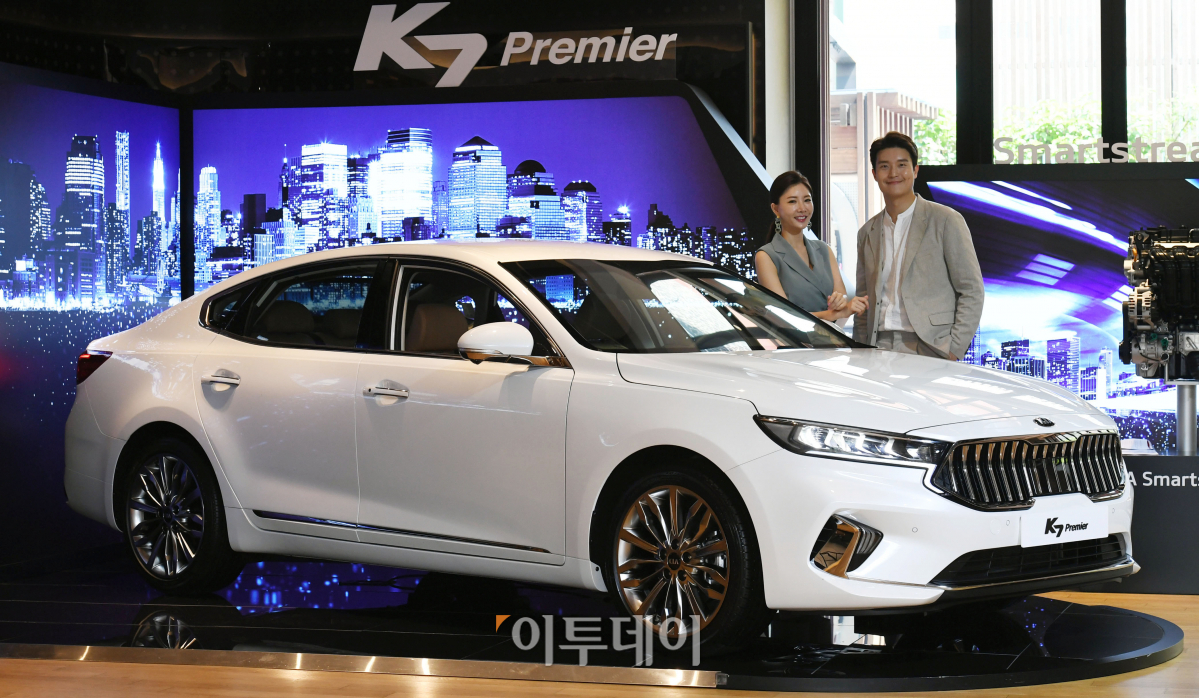 기아자동차가 12일 서울 강남구 압구정로 BEAT360에서 ‘K7 프리미어(PREMIER)’ 사진영상 발표회를 갖고 있다. 이날부터 사전계약을 시작하는 K7 프리미어는 2016년 출시 후 3년만에 선보이는 부분변경(페이스리프트) 모델로 기아차의 차세대 엔진 스마트스트림 G2.5 GDi를 처음으로 적용, 연비와 정숙성을 개선했다. 신태현 기자 holjjak@