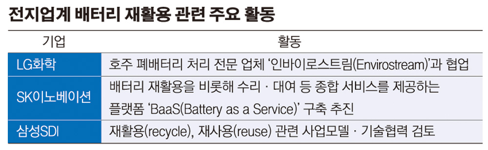 친환경 경영을 위해 ‘독한 혁신’을 선언한 SK이노베이션 역시 회수한 폐배터리를 에너지저장장치(ESS)와 연관시켜 수익성을 창출하는 모델 등 폐배터리 리사이클링과 관련된 연구개발(R&D)에 공을 들이고 있다.