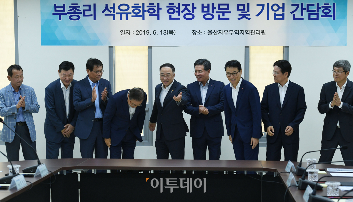 홍남기(가운데) 경제부총리 겸 기획재정부 장관이 석유화학업종 현장방문차 13일 울산 울주군 청량읍 울산자유무역지역관리원을 찾아 김창범 한화케미칼 부회장 등 석유화학기업 대표들과 인사한 뒤 자리로 향하고 있다. 신태현 기자 holjjak@