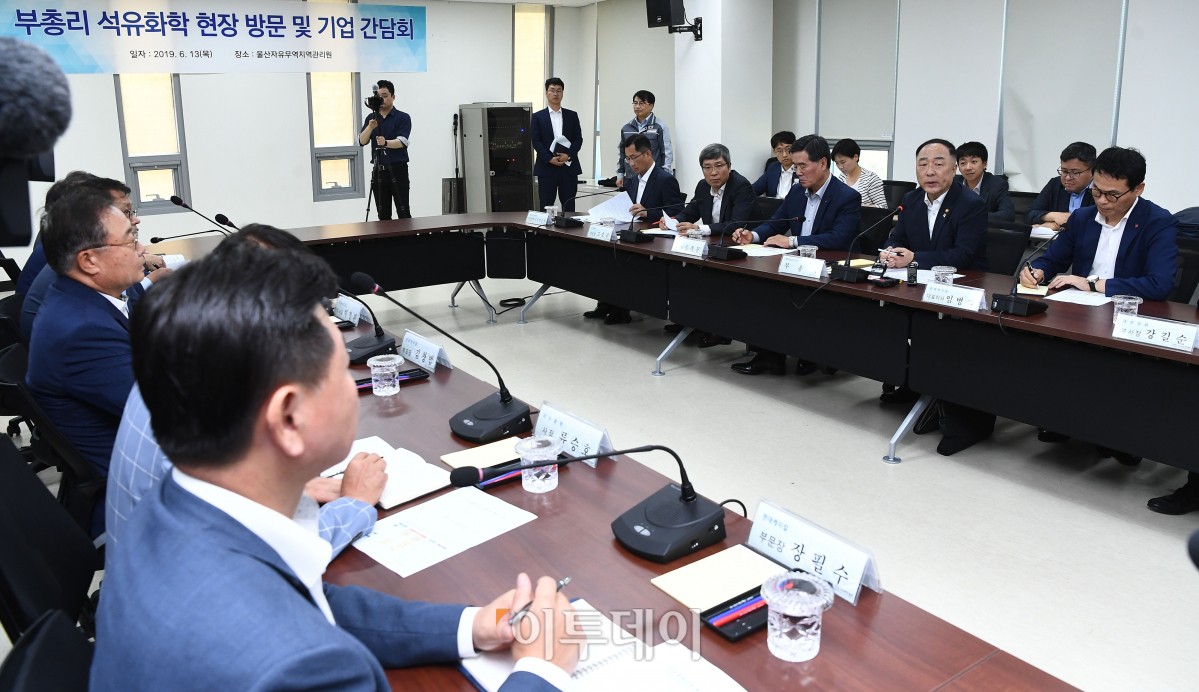 홍남기 경제부총리 겸 기획재정부 장관이 석유화학업종 현장방문차 13일 울산 울주군 청량읍 울산자유무역지역관리원을 찾아 석유화학기업 대표들과 간담회를 갖고 있다. 신태현 기자 holjjak@