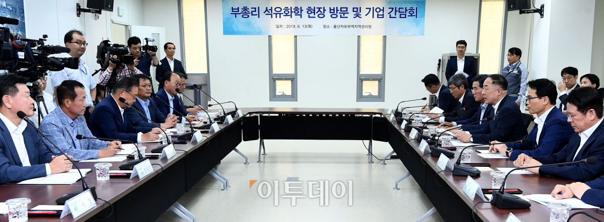 홍남기 경제부총리 겸 기획재정부 장관이 석유화학업종 현장방문차 13일 울산 울주군 청량읍 울산자유무역지역관리원을 찾아 석유화학기업 대표들과 간담회를 갖고 있다. 신태현 기자 holjjak@