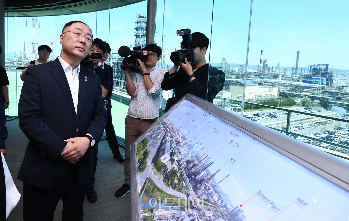 홍남기 경제부총리 겸 기획재정부 장관이 석유화학업종 현장방문차 13일 울산 남구 신여천로 SK이노베이션 울산 콤플렉스(CLX)를 찾아 공장 전경을 바라보고 있다. 신태현 기자 holjjak@