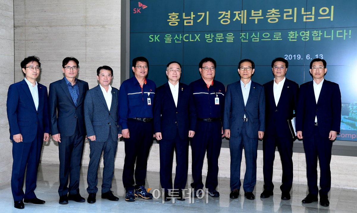 홍남기(가운데) 경제부총리 겸 기획재정부 장관이 석유화학업종 현장방문차 13일 울산 남구 신여천로 SK이노베이션 울산 콤플렉스(CLX)를 찾아 박경환(왼쪽 네번째) 울산CLX 총괄 부사장 등과 기념촬영을 하고 있다. 신태현 기자 holjjak@