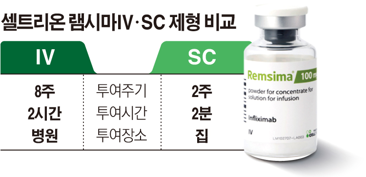 램시마SC는 류마티스관절염 환자 362명을 대상으로 한 임상 결과 투여 30주 차까지 램시마 투여군과 유사한 안전성 결과가 나타났다. 효과 면에서도 램시마 투여군 대비 근소하게 높은 것을 확인했다.