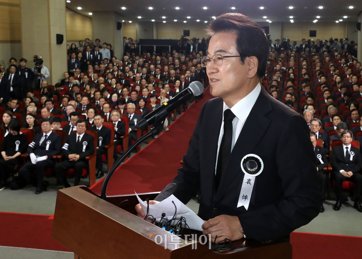 민주평화당 정동영 대표가 14일 오전 서울 동작구 국립현충원 내 현충관에서 엄수된 고(故) 이희호 여사의 사회장 추모식에서 추도사하고 있다. 신태현 기자 holjjak@