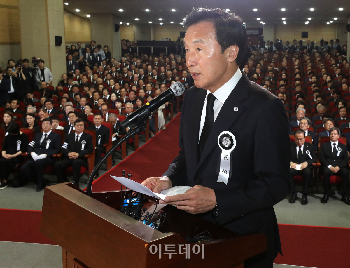 바른미래당 손학규 대표가 14일 오전 서울 동작구 국립현충원 내 현충관에서 엄수된 고(故) 이희호 여사의 사회장 추모식에서 추도사하고 있다. 신태현 기자 holjjak@
