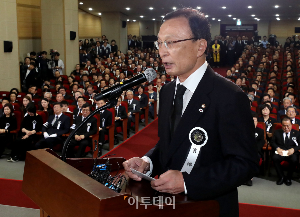 더불어민주당 이해찬 대표가 14일 오전 서울 동작구 국립현충원 내 현충관에서 엄수된 고(故) 이희호 여사의 사회장 추모식에서 추도사하고 있다. 신태현 기자 holjjak@