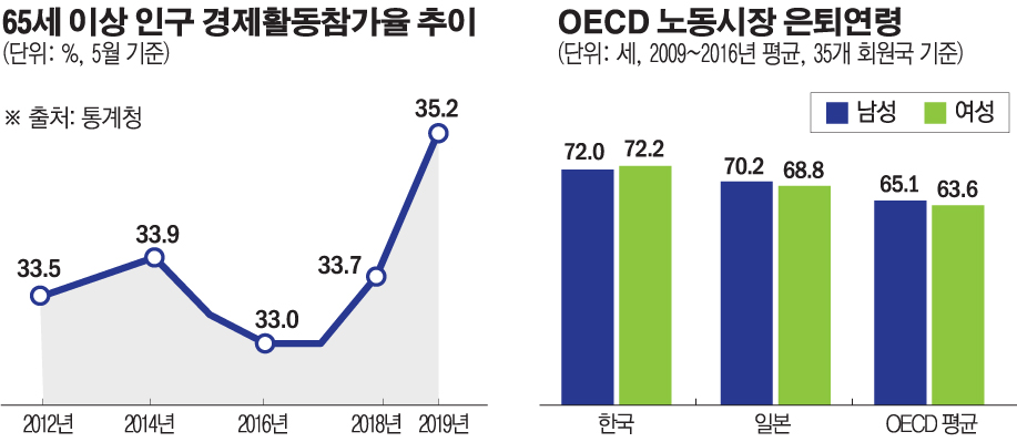 16일 통계청에 따르면, 지난달 15세 이상 및 15~64세 경활률은 각각 64.0%, 70.0%를 기록했다. 5월 기준으론 통계가 집계된 1999년 이후 가장 높은 수치다. 특히 60세 이상에서 44.3%로 전년 동월보다 1.6%포인트(P) 상승했다. 이들의 경활률이 오른 가장 큰 배경은 노인 일자리 확대다. 직접 일자리 사업인 노인 일자리는 올해 공급량이 지난해보다 10만 개 늘었다.