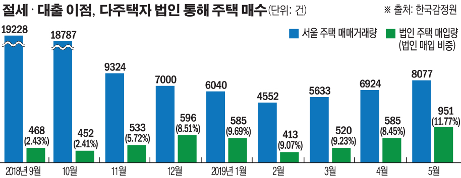 법인 매입의 비중 증가는 서울 주택 거래가 얼어붙은 상황에서도 법인은 주택을 꾸준히 사들인 결과다. 특히 세금 이슈가 발생할 때 법인 거래가 전달보다 급증했다. 지난해 4월 다주택자에 대한 양도세 중과가 시작되기 전에도 3월 법인 매입 거래는 959건을 기록한 바 있다.