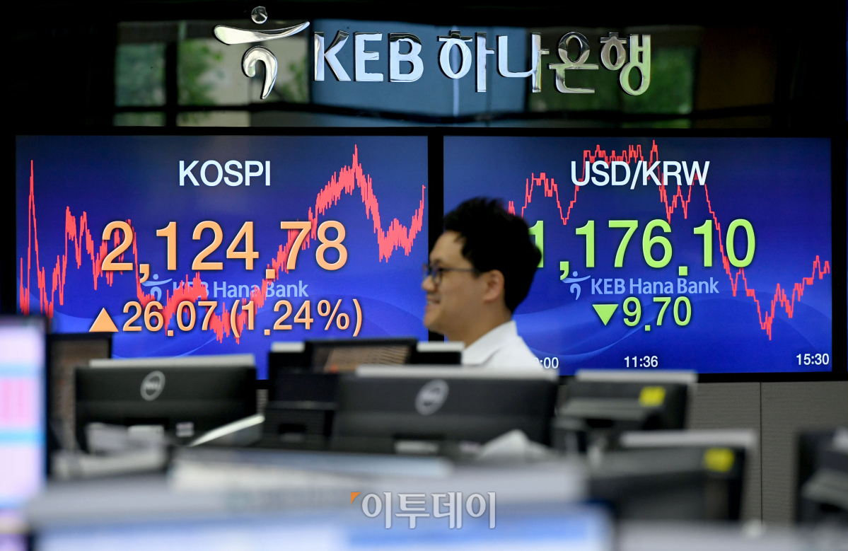 코스피가 미중 분쟁 완화 분위기에 1% 이상 상승 마감한 19일 서울 중구 을지로 KEB하나은행 딜링룸 전광판에 코스피지수가 전 거래일보다 26.07포인트(1.24%) 오른 2124.78을 가리키고 있다. 종가 기준으로 지난 5월 8일(2168.01) 이후 40여일 만의 최고치로 원달러 환율은 9.70원 내린 1,176.10원으로 거래를 마쳤다. 신태현 기자 holjjak@