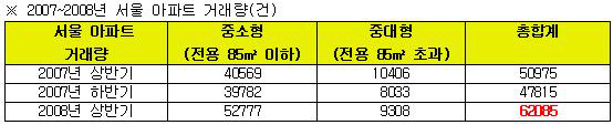 서울지역 아파트 거래량은 지난해 상반기 5만975건이 거래됐지만 하반기에는 거래시장이 크게 위축되면서 3천160건 감소한 4만7815건으로 줄었다. 하지만 올 상반기에는 6만2085건이 거래돼 1만건 이상 거래량이 증가했다.