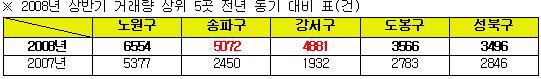 각 구별로 살펴보면 노원구가 6554건으로 가장 많은 거래량을 보였고, 뒤를 이어 송파구 5072건, 강서구 4881건, 도봉구 3556건, 성북구 3496건 순으로 거래가 이뤄졌다.