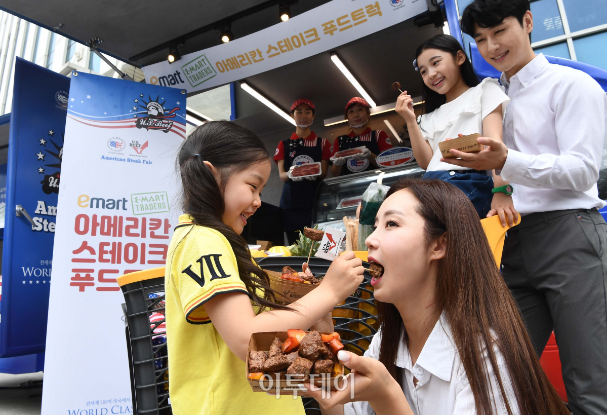 미국육류수출협회가 26일 서울 성동구 뚝섬로 이마트 성수점에서 ‘아메리칸 스테이크’ 푸드트럭을 홍보하고 있다. 미국육류수출협회의 아메리칸 스테이크 푸드트럭은 27일부터 6개월간 전국 28개 이마트 지점을 순회하며 미국산 스테이크 시식 및 할인판매를 한다. 신태현 기자 holjjak@
