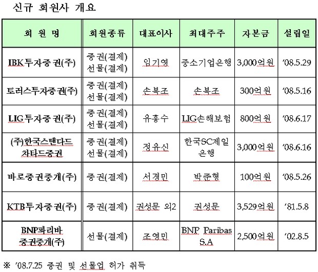증권선물거래소는 28일 IBK투자증권 등 신규 회원가입을 신청한 7개사에 대해 회원자격을 부여하고 29일부터 거래소에서 매매할 수 있도록 한다고 밝혔다.
