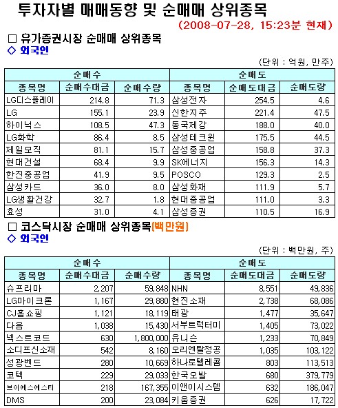 반면 LG디스플레이(214억원), LG(155억원), LG화학(86억원), LG생활건강(32억원) 등 LG그룹 관련주가 순매수 종목 상위 10개 중 4개나 올랐으며 하이닉스(108억원), 제일모직(81억원) 등을 사들였다.