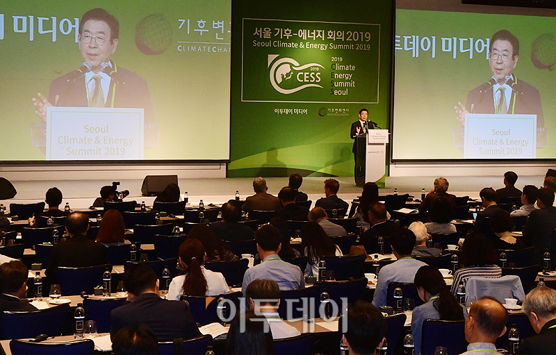박원순 서울시장이 27일 서울 종로구 새문안로 포시즌스호텔서울에서 열린 '서울 기후-에너지 회의 2019'에서 축사를 하고 있다. '세계화 4.0과 신기후체제 대응 스마트시티 전략을 주제'로 재단법인 기후변화센터와 이투데이 미디어가 공동 주최한 이번 행사는 지속가능한 경제발전을 이끌어가는 스마트시티 및 기후-에너지 분야의 동향과 비전을 소개함으로써 지속가능한 경제 성장의 모멘텀 창출에 기여하기 위해 마련됐다. 고이란 기자 photoeran@