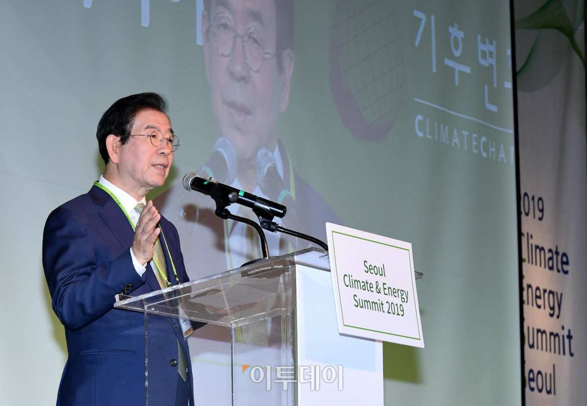 박원순 서울시장이 27일 서울 종로구 새문안로 포시즌스호텔서울에서 열린 ‘서울 기후-에너지 회의 2019’에서 축사를 하고 있다. ‘세계화 4.0과 신기후체제 대응 스마트시티 전략’을 주제로 재단법인 기후변화센터와 이투데이 미디어가 공동 주최한 이날 회의는 지속가능한 경제발전을 이끌어가는 스마트시티 및 기후-에너지 분야의 동향과 비전을 소개함으로써 지속가능한 경제 성장의 모멘텀 창출에 기여하기 위해 마련됐다. 신태현 기자 holjjak@