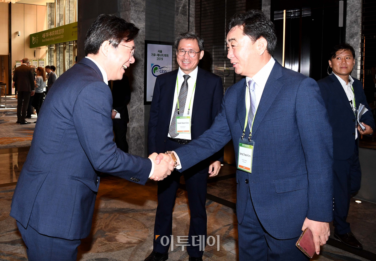 김상철(오른쪽) 이투데이 대표이사와 성윤모 산업통상자원부 장관이 27일 서울 종로구 새문안로 포시즌스호텔서울에서 열린 ‘서울 기후-에너지 회의 2019’에서 악수를 하고 있다. ‘세계화 4.0과 신기후체제 대응 스마트시티 전략’을 주제로 재단법인 기후변화센터와 이투데이 미디어가 공동 주최한 이날 회의는 지속가능한 경제발전을 이끌어가는 스마트시티 및 기후-에너지 분야의 동향과 비전을 소개함으로써 지속가능한 경제 성장의 모멘텀 창출에 기여하기 위해 마련됐다. 신태현 기자 holjjak@