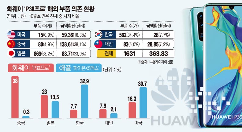 신문에 따르면 화웨이의 신형 스마트폰 ‘P30프로’를 분해한 결과, 총 1631개의 부품, 363.83달러어치가 사용됐다. 이 가운데 부품 메이커의 국적별 비율(금액환산 기준)을 보면 한국 미국 일본 3개국이 50% 가까이 차지했다. 이 가운데 미국 기업의 비율은 16.3%로, 코닝의 커버 글래스 등 고부가가치 부품이 많았다. 미국산 부품은 겨우 15개가 쓰이지만 금액은 59달러가 넘는다. 일본은 소니 카메라를 비롯해 화웨이 스마트폰 부품의 23%를 차지했고, 한국은 8% 가까운 비율을 보였다. 한국은 화웨이 스마트폰에 들어가는 부품이 562개로 일본(869) 다음으로 많지만 금액 상으로는 5개국 중 가장 낮았다.