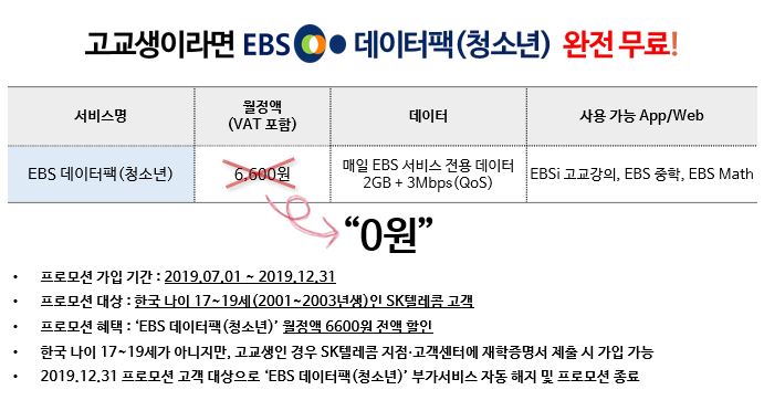 17~19세(2001~2003년생)인 고객은 EBS 데이터팩(청소년) 신청 시 이용료가 자동 지원된다. 한국 기준 17~19세가 아니지만 고교생인 경우 SK텔레콤 지점·고객센터에 재학증명서를 제출하면 된다. 이번 프로모션이 끝나면 혜택을 받고 있던 EBS 데이터팩(청소년) 부가서비스를 일괄적으로 자동 해지할 예정이다.