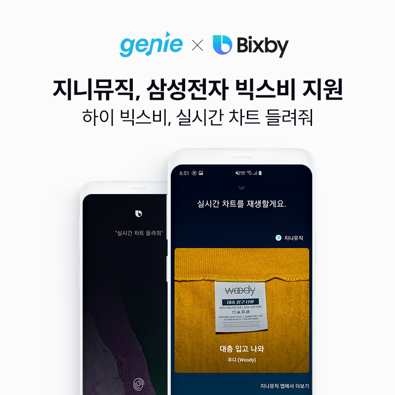 지니뮤직은 개방형 AI 플랫폼 빅스비와 기술연동을 진행해 지니서비스를 상용화했다. 지니고객들이 빅스비를 통해 손쉽게 음성명령으로 듣고 싶은 노래를 검색해 마음껏 음악을 즐길 수 있다. 또 빅스비 음성명령으로 다양한 장르, 상황과 감성을 고려한 테마 추천음악들을 빠르고 편리하게 감상할 수 있다.