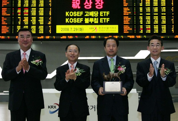 증권선물거래소 유가증권시장본부는 29일 오전8시30분부터 서울사옥 종합홍보관에서 배당성향이 높은 주식과 업종대표 핵심우량주에 분산투자 효과를 갖는 상품인 KOSEF 고배당 및 블루칩 ETF의 상장기념식을 개최했다.