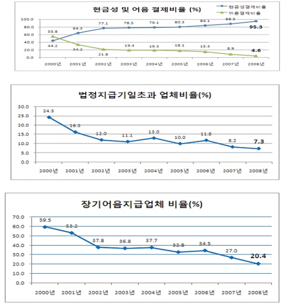 하도급대금을 어음으로 지급한 업체중 장기어음(만기일 60일 초과)으로 지급한 업체비율도 27.0%→20.4%로 줄었다.